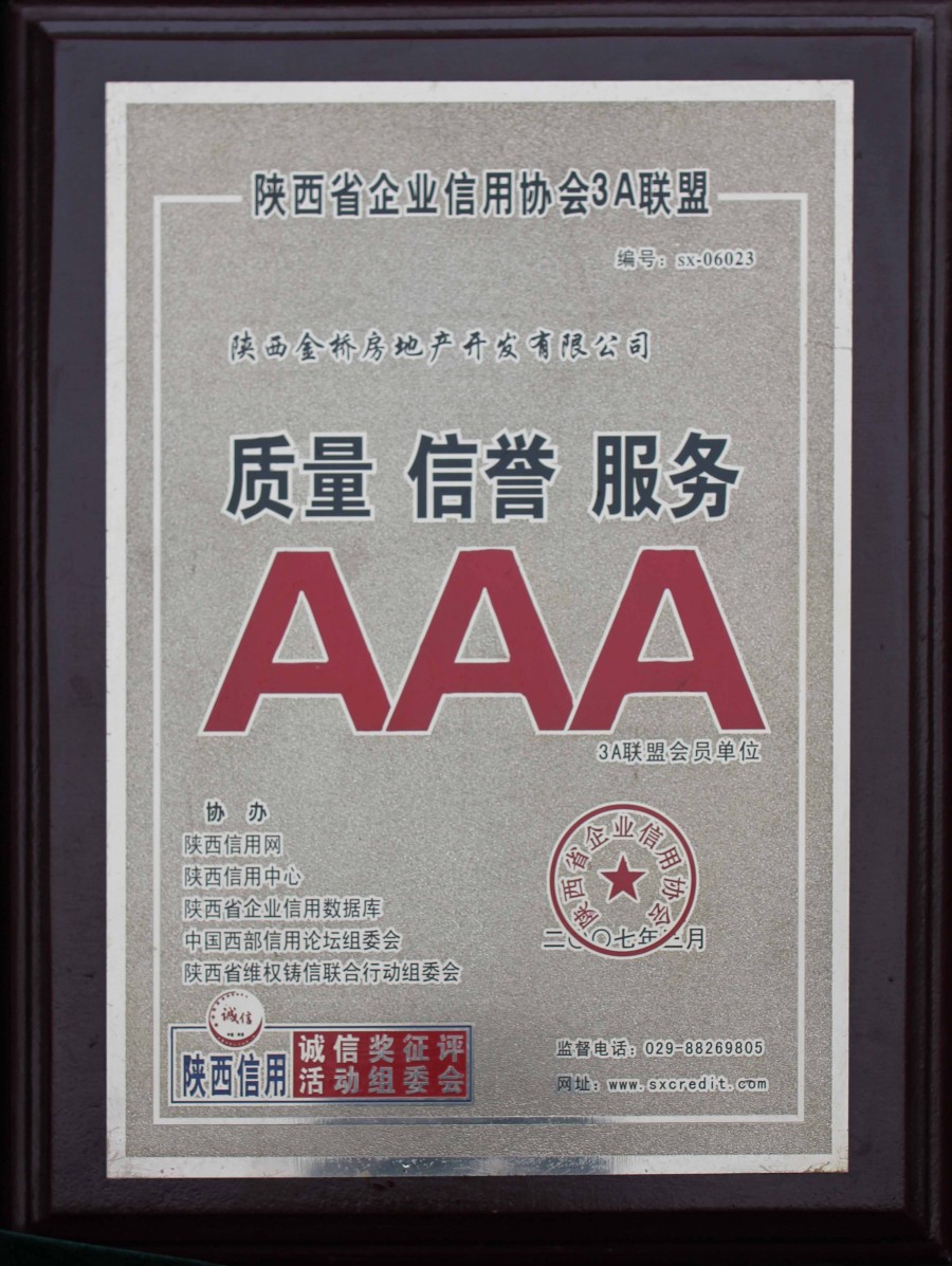 陕西省企业信用协会3A联盟质量、信誉、服务AAA企业